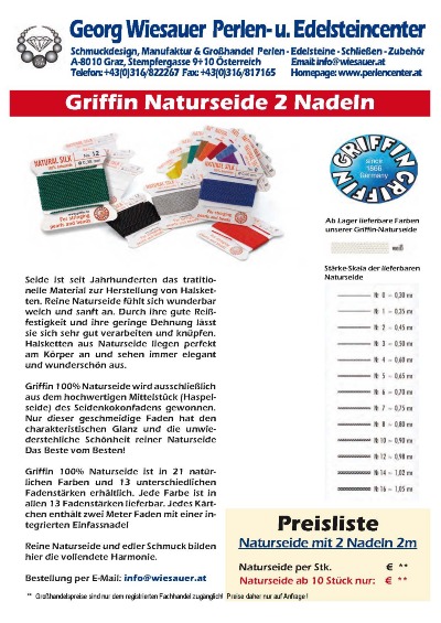 Download als PDF: Naturseide Weiß mit 2 Nadeln: Griffin Naturseide 2 Nadel red.pdf Mehr Details folgen im Laufe der kommenden Tage. Preise für Groß- und Einzelabnahme auf Anfrage. Bestellliste Naturseide als PDF-Download: Bestellliste Naturseide 1+2 Nadeln.pdf